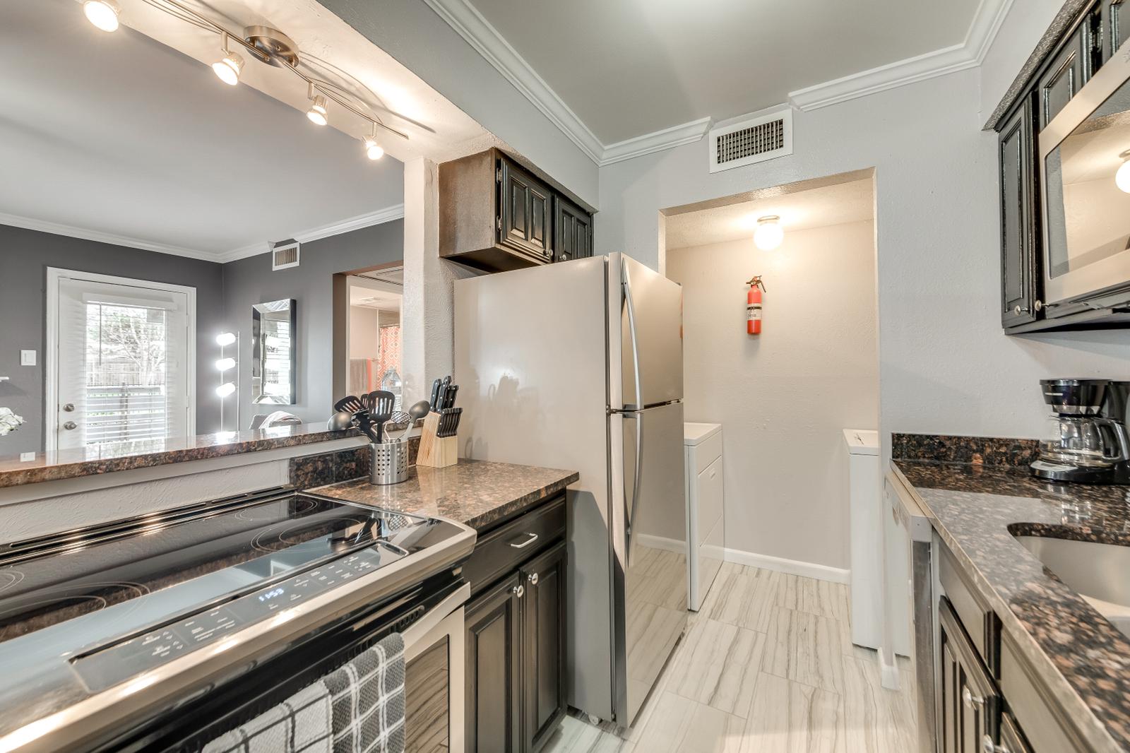 Serene 1BD in gated community—sophisticated ground-flr unit with leather/glass accents. Amenities: washer/dryer, Wi-Fi, TV, utilities. Perfect for traveling nurses & business travelers. Near Baylor Med. CTR, highways, and DFW Airport.