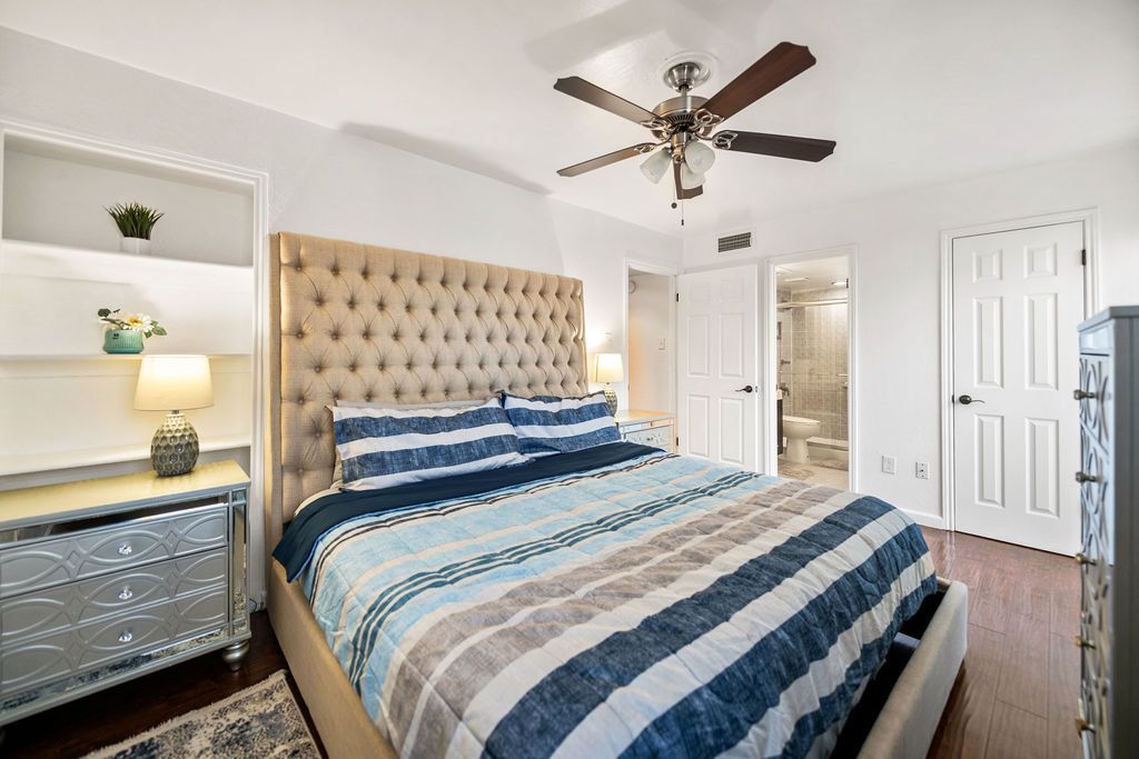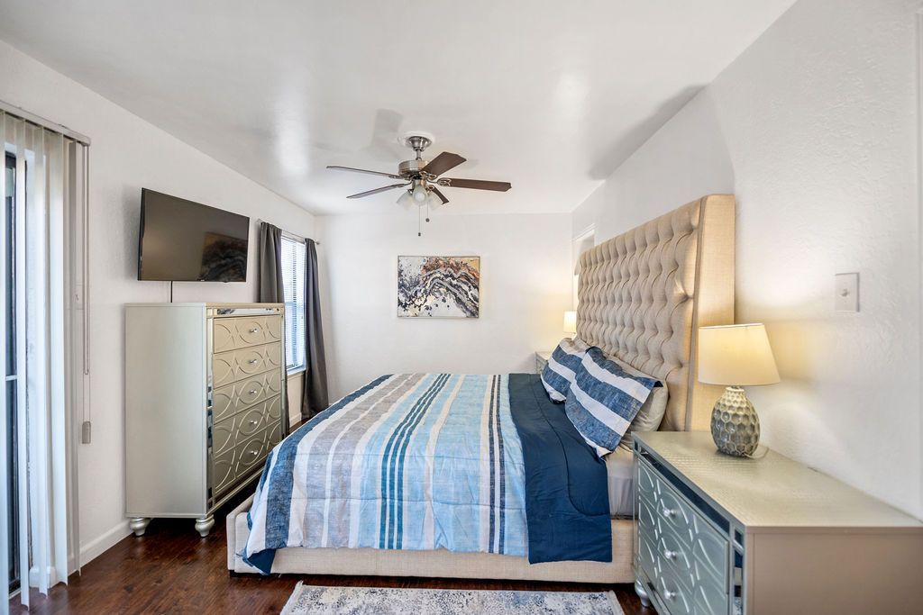 The bedroom is furnished with a spacious King-size bed and a TV, offering ample storage space and shelves. The kitchen has been completely upgraded and features a modern stainless steel appliance set with a side-by-side refrigerator. The living room is equipped with a large 50-inch TV, and there's also a dedicated desk setup in the living area for added convenience.