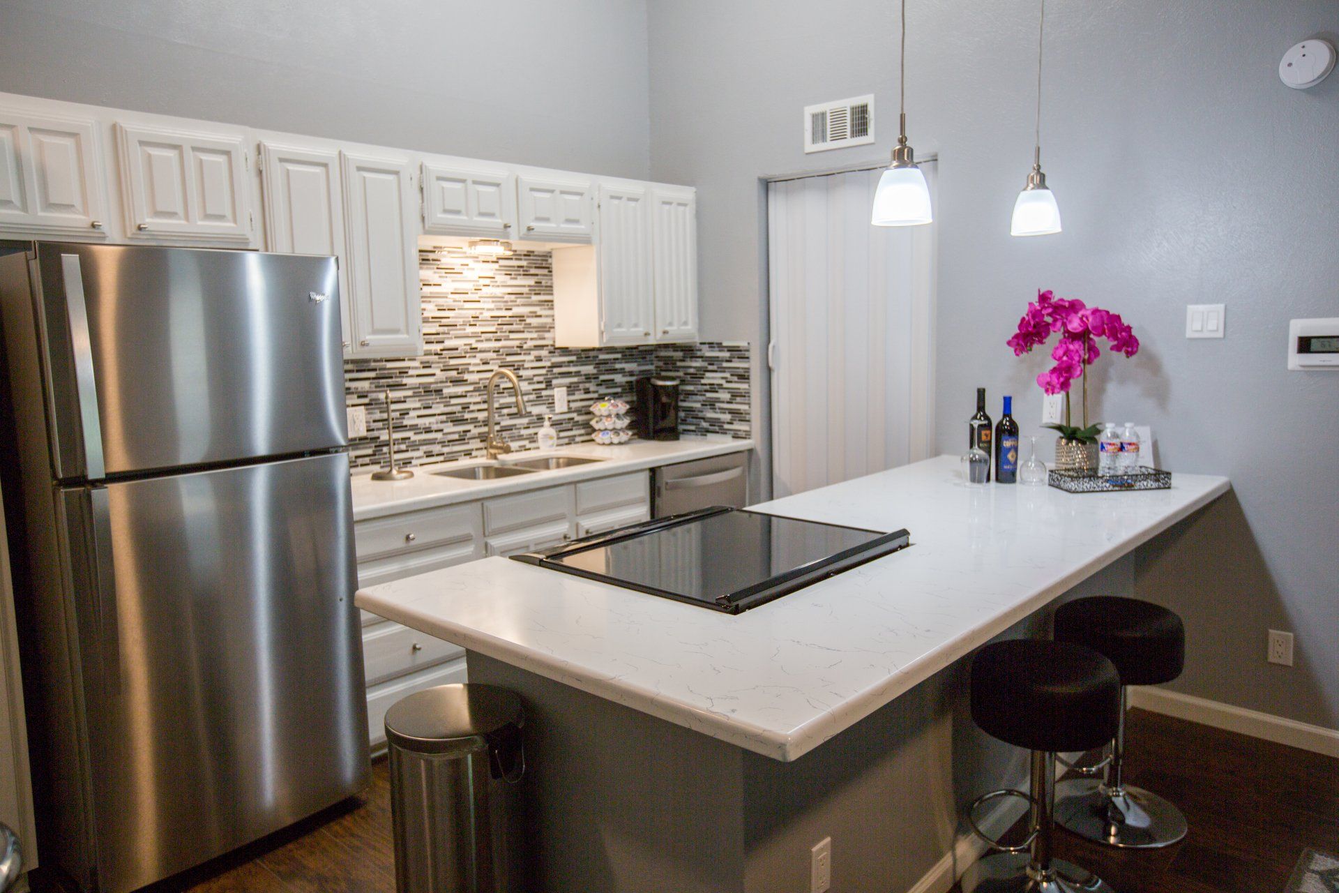 Experience luxury with a recently remodeled bathroom featuring polished porcelain tile and glass strip mosaic accents. Enjoy hardwood floors and fresh paint throughout. The kitchen showcases white granite countertops with gray veins and a stylish backsplash with a glass and grey mosaic. This upscale unit provides all home comforts, including two smart TVs, high-speed internet, iron with board, hairdryer, and a fully equipped full-size kitchen with stainless steel appliances. The well-lit complex offers a reserved parking space, community pool, video security, and more.