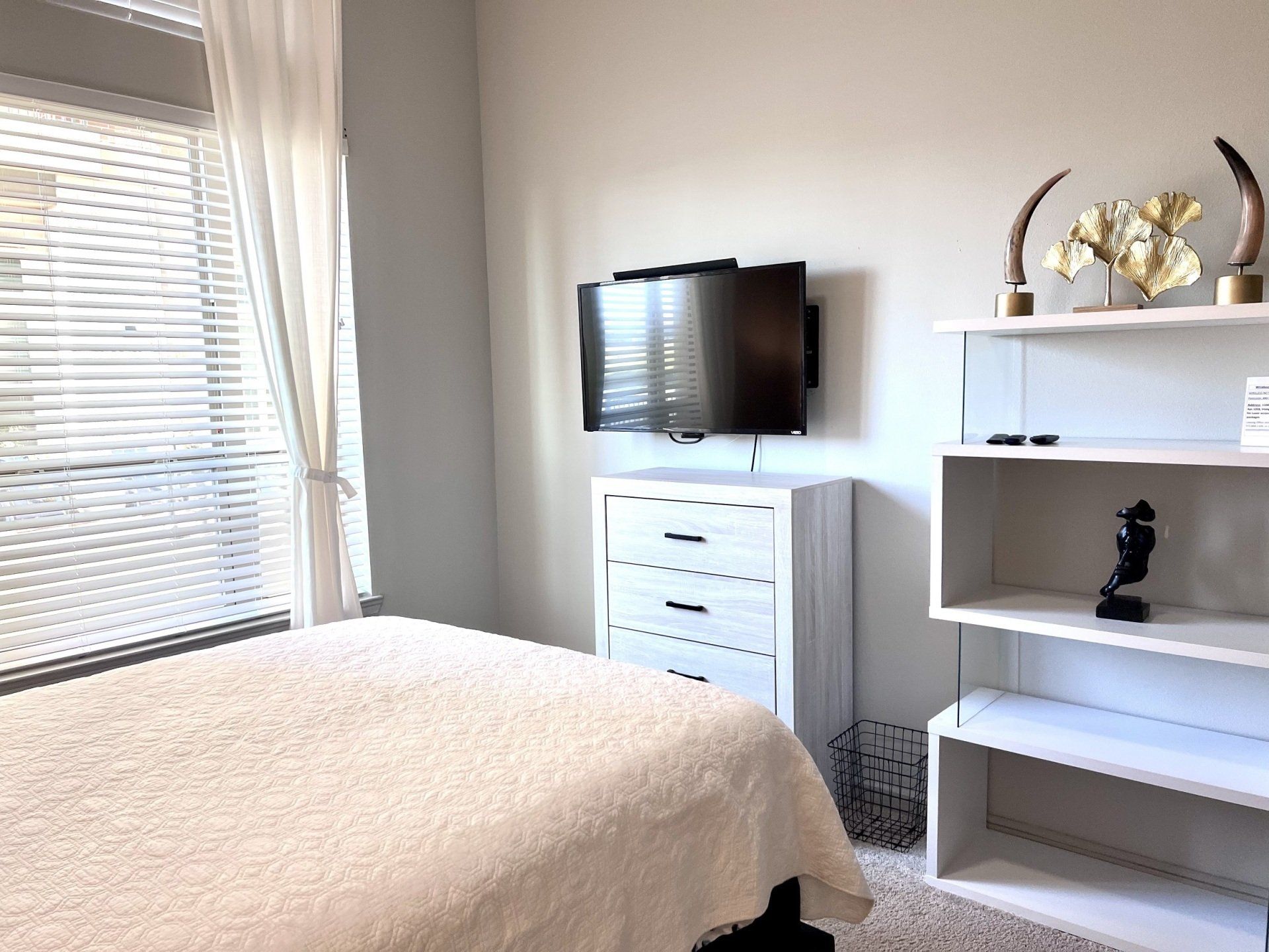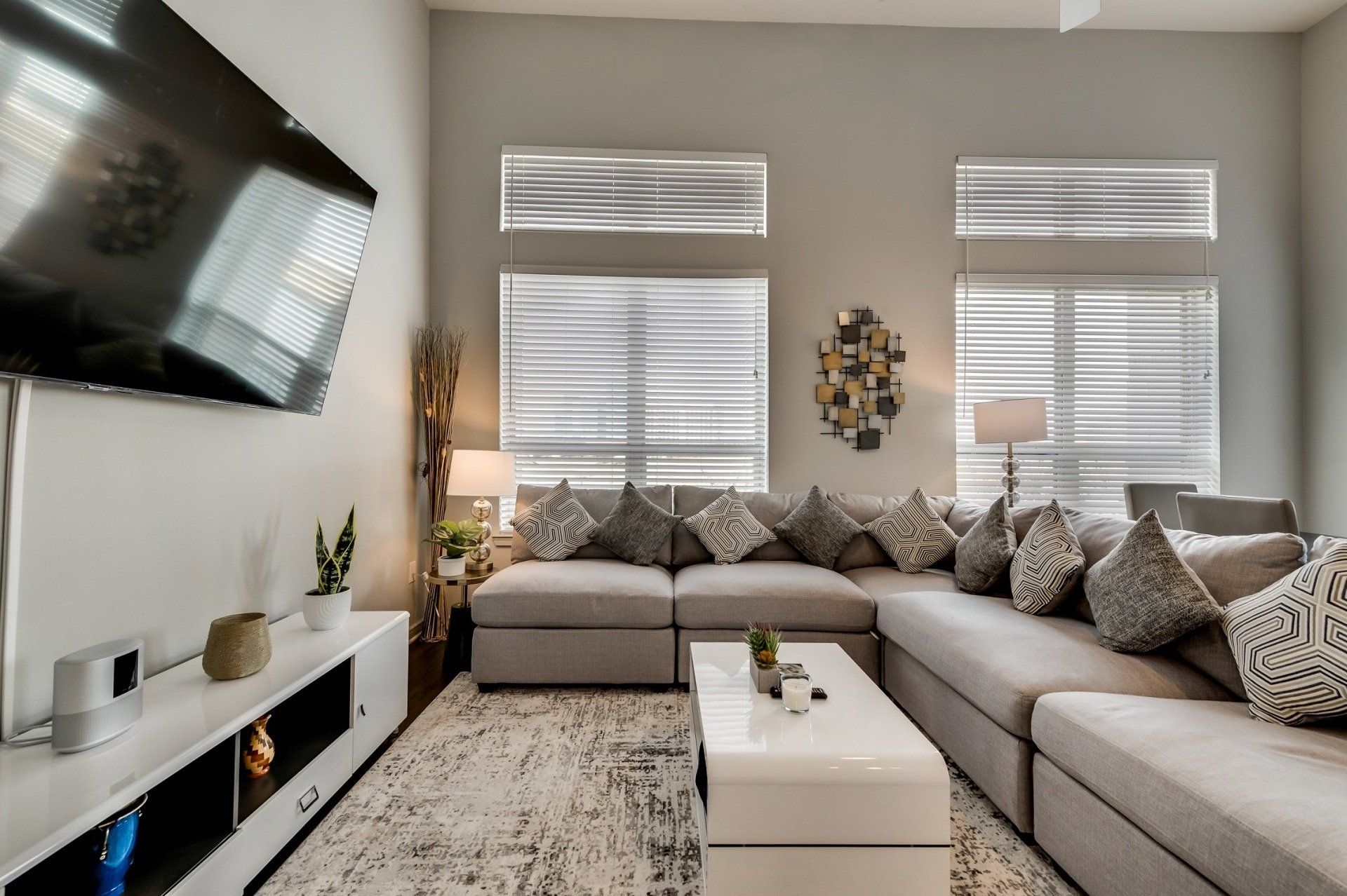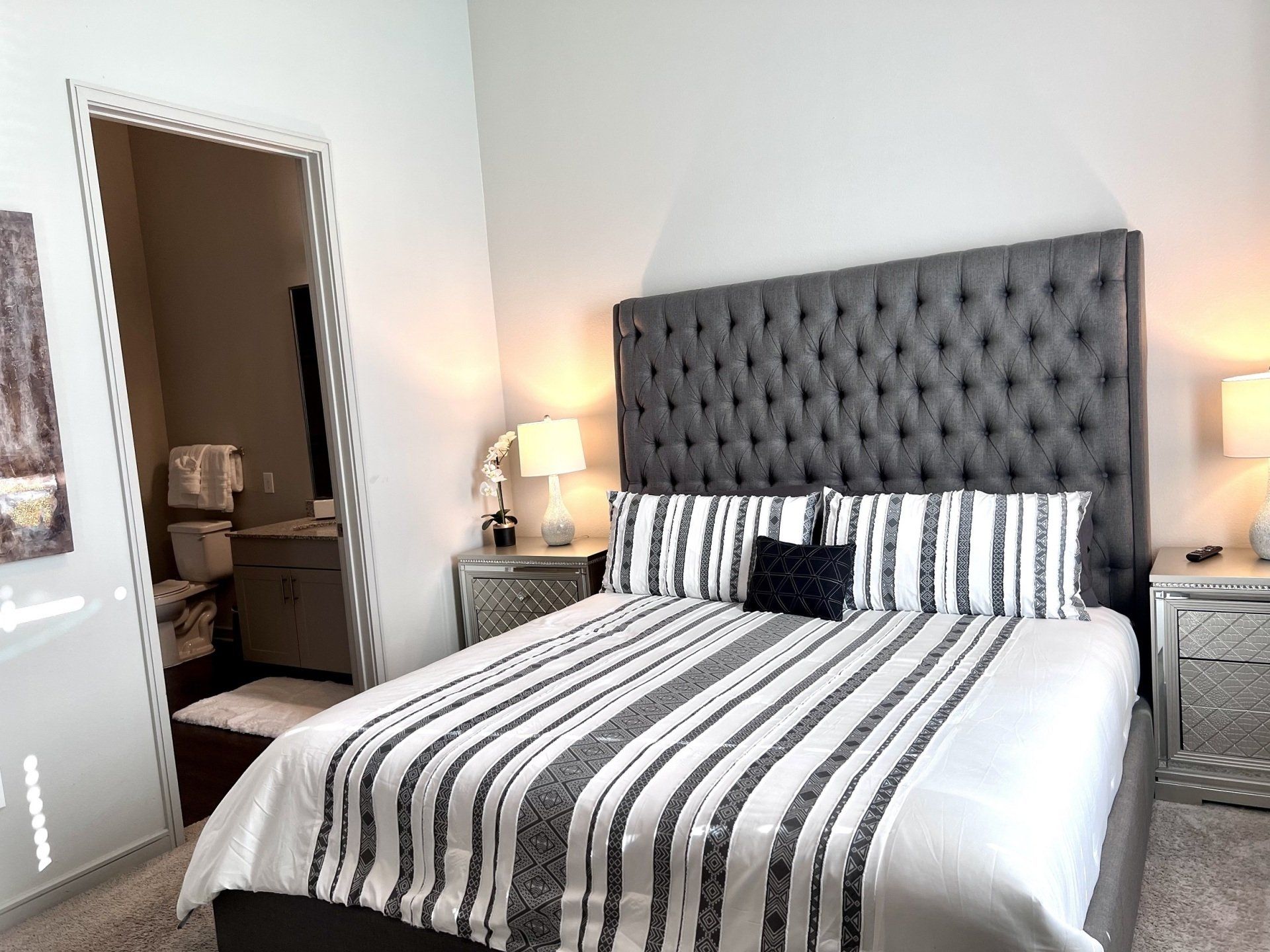 Indulge in our "Boss's Crib Collection" – an ultra-modern 3bedroom 2bath furnished boutique apartment. The fully-equipped kitchen features stainless appliances, granite countertops, sleek maple cabinetry, a pantry, and kitchen islands with built-in cooktops. Washer and dryer are conveniently located in-unit. Immerse yourself in urban living, minutes from Toyota Music Factory and acclaimed restaurants. Our prime location ensures easy access to DFW International Airport and Love Field. Consider these boutique furnished apartments in Las Colinas as your next home. Room dimensions include a master bedroom at 14ft x 13ft, living and dining area at 20ft x 14ft, Bedroom 2 at 10ft x 11ft, and Bedroom 3 at 10ft x 12ft.