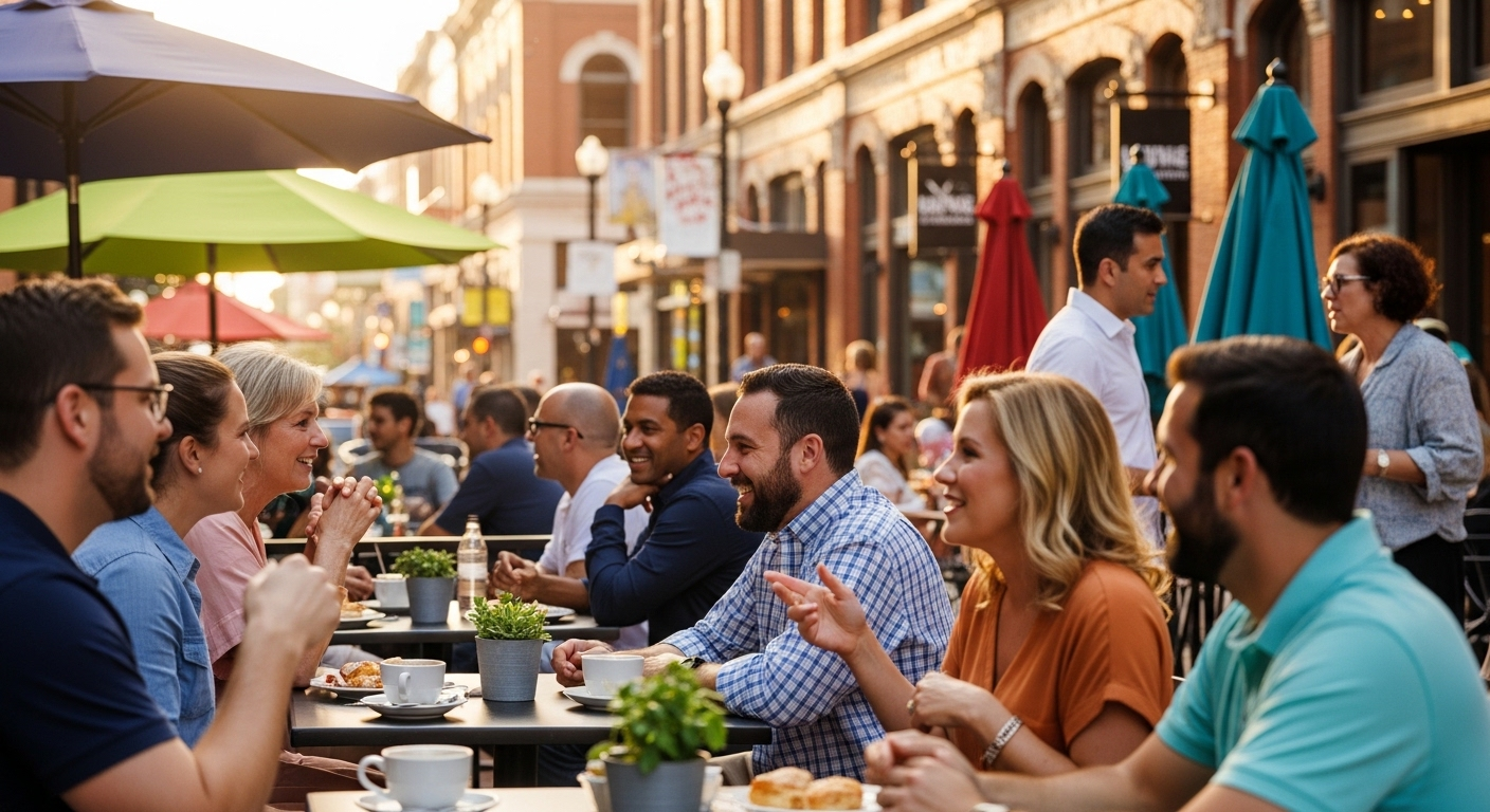 Market Buzz – Happy chatter from cafes and outdoor patios.