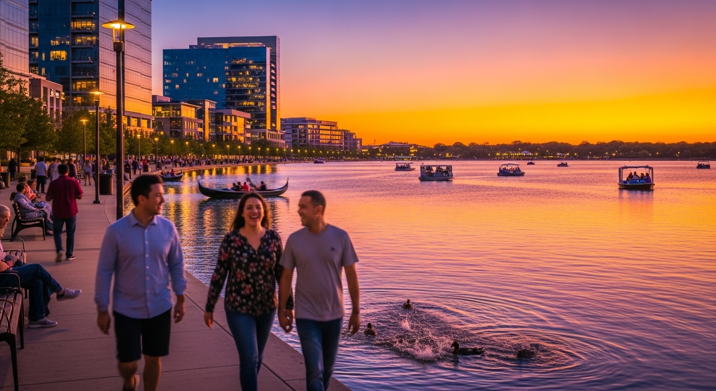 Waterfront Evenings – Soft splashes and happy chatter along Lake Carolyn at sunset.
