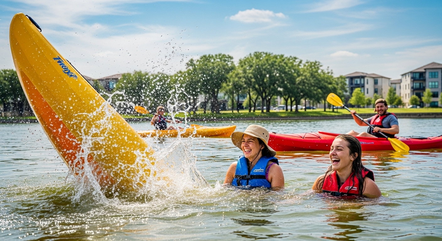 Lakeside Fun – Kayaks, laughter, and water splashes at Towne Lake.